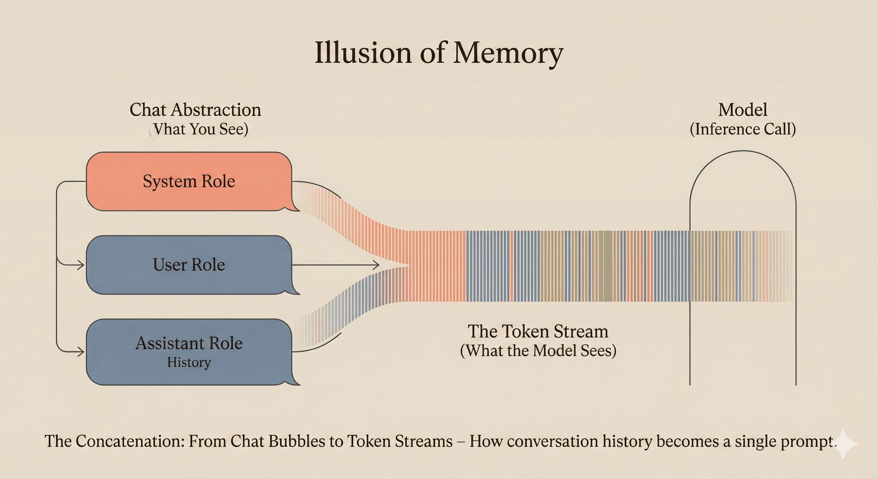 Here’s something crucial to understand: the model doesn’t “remember” conversations. Every single time you send a message, all the conversation history is concatenated into a single prompt string with special tokens marking role transitions.
