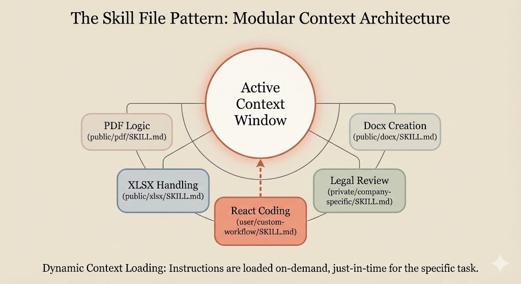 Anthropic’s internal architecture reveals this pattern clearly. They maintain skill directories containing SKILL.md files with specialized instructions for different task types: document creation, spreadsheet manipulation, PDF handling, frontend design, and more.